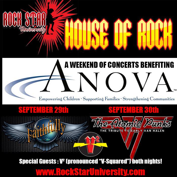 Make sure to check out the upcoming shows at Rock Star University House of Rock, top notch premiere venue in the Bay Area. Upcoming shows include a weekend of benefit concerts for ANOVA Center for Education, a school for autism and learning differences. The weekend of September 29th & 30th will have shows featuring tribute bands, The Atomic Punks (Van Halen tribute) and Faithfully (Journey tribute)